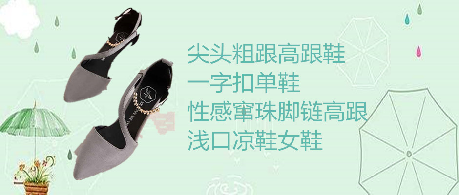 尖头粗跟高跟鞋一字扣单鞋 性感窜珠脚链高跟浅口凉鞋女鞋