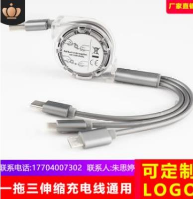 手机卡通伸缩三合一数据线礼品熊猫数据线一拖三快充线可印LOGO