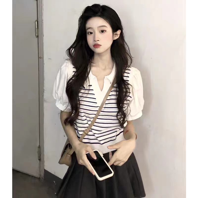 POLO领条纹假两件冰丝短袖T恤女夏季修身内搭打底衫薄款v领上衣