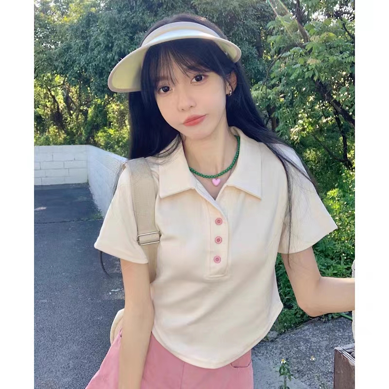 杏色polo领正肩短袖t恤女夏季小众设计感辣妹修身短款不规则上衣