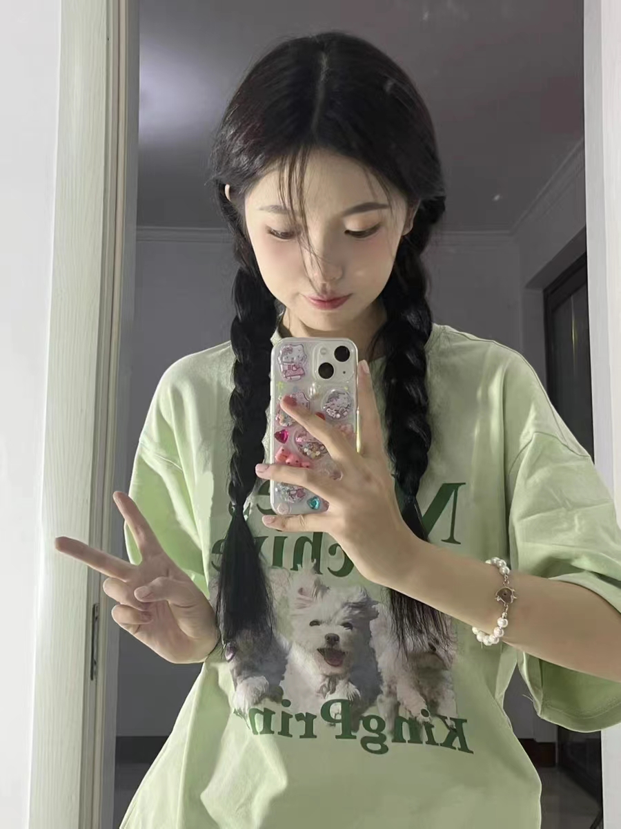 美式复古卡通小狗绿色圆领纯棉短袖T恤女夏季宽松显瘦百搭上衣ins