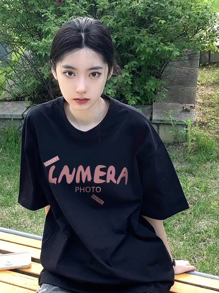 美式复古oversize潮黑色上衣夏季宽松小众别致正肩纯棉短袖T恤女