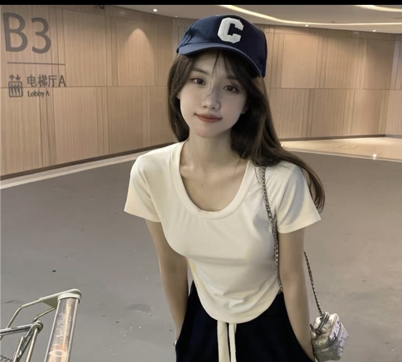 2023夏季设计感小众纯欲风甜辣妹性感u领短袖t恤女不规则短款上衣