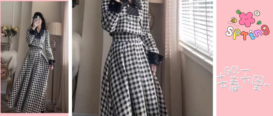 法式气质千鸟格翻领长袖上衣收腰半身裙套装女 套装(上衣+半身裙) 黑白 s