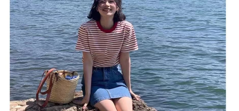 阿代家/日系复古 红色条纹正肩短袖 t恤女夏季小个子 宽松半袖别致上衣