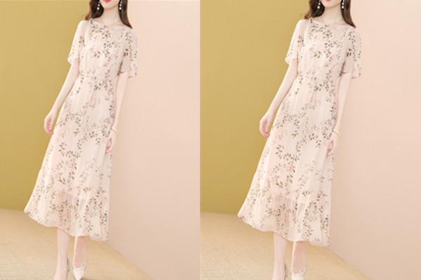 LEDE雪纺连衣裙女装夏装修身显瘦超仙气质中长款小个子碎花裙子夏天短袖衣服潮 S