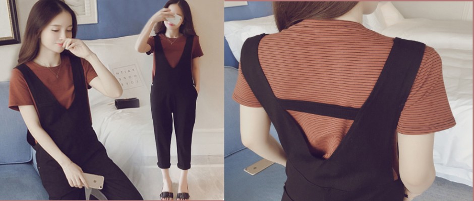 夏季新款韩版宽松减龄背带裤女小个子两件套装显瘦高腰连体裤 v领背带裤+白T恤 S