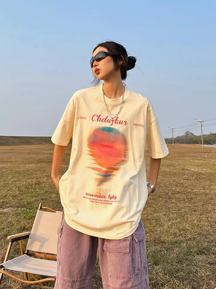 美式复古日落短袖T恤女夏季新款宽松设计感情侣装半袖T恤,纯棉