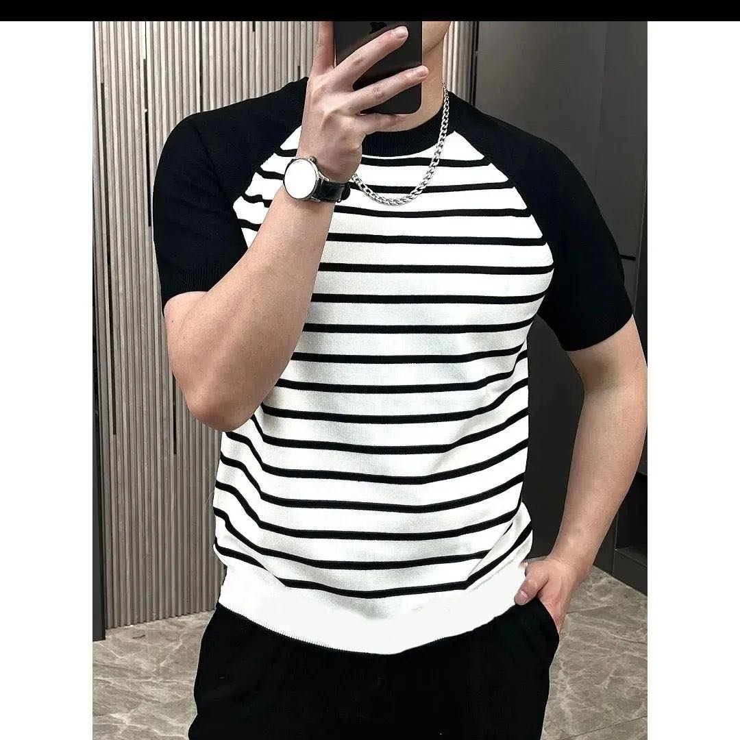 2023夏款新品男士欧货T恤圆领简约条纹气质休闲百搭潮流时尚男