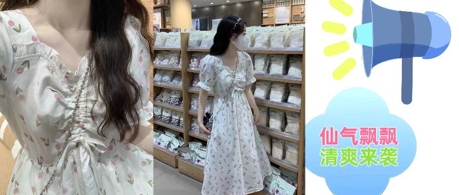 法式清新甜美碎花连衣裙温柔风初恋收腰显瘦泡泡袖抽绳减龄裙子夏,面料舒服,好看,价格实惠