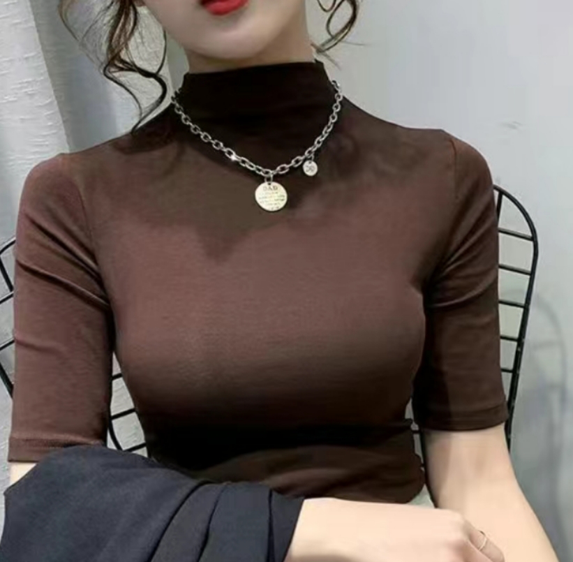 打底衫女春秋款半高领纯色上衣2023新款港风洋气内搭中袖修身T恤