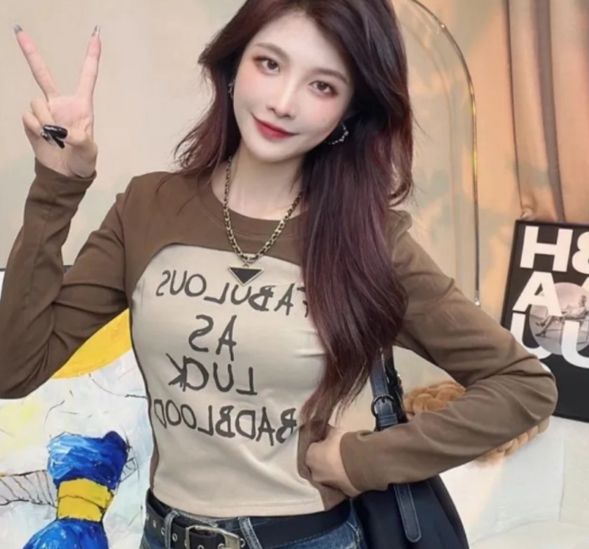 笑歌【圆领拼接长袖t恤】2023秋季新款印花修身短款收腰打底衫ins