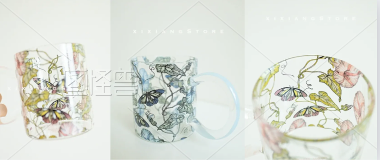 复古蝴蝶花朵印花玻璃牛奶杯小众美式英式咖啡耐高温插画 粉色