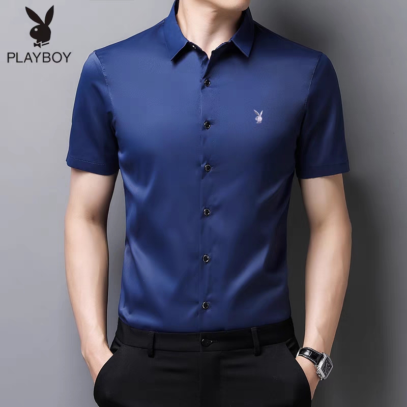 花花公子冰丝短袖衬衫男2023款半袖大码纯色免烫抗皱弹力白衬衣夏 白色 S