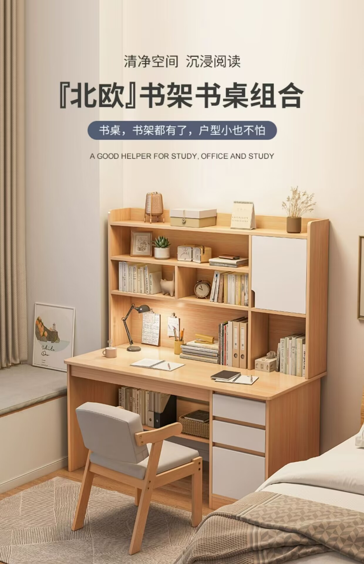 书桌书架一体桌子家用学生学习写字卧室办公桌工作台式电脑桌书柜