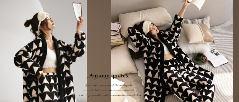 睡衣选用保暖、透气、舒适的面料,3D提花绒面料在穿着舒舒适、柔软、亲肤同时还能够为您添置一份舒适感。
