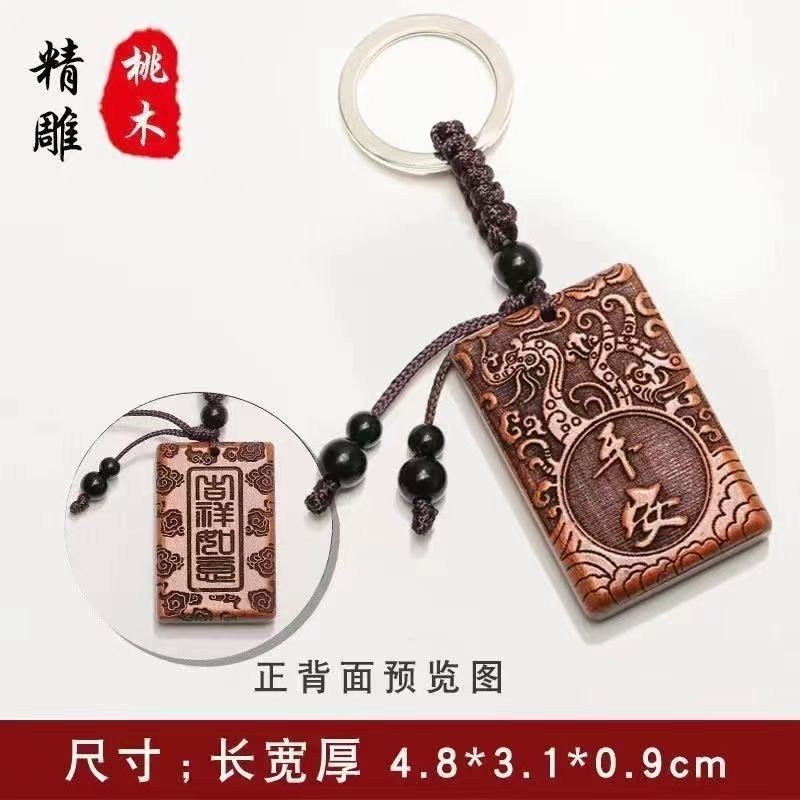 桃木材质:选用上等的桃木作为原材料,桃木因其纹理美丽、坚硬耐用,一直以来都是传统的吉祥木材携带便利:设计成钥匙扣的形式,方便随身携带。可以将其挂在钥匙、包包、背包等随身物品上,不仅美观,也能让佩戴者时刻感受到护身符的保佑。