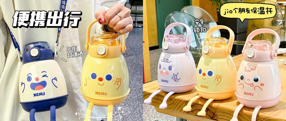弹跳开关,手提便携,可爱脚可当手机支架,密封锁水,背带随意切换,SUS316内底耐磨耐用,四种颜色任你挑选。