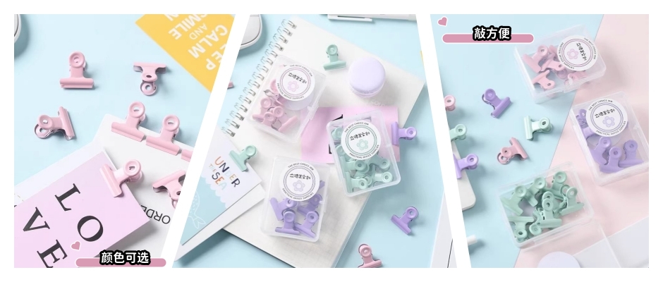 马卡龙票据小夹子每盒装8枚,小清新有粉色、紫色、绿色,小夹子很实用,材质结实,夹的牢固,颜色很漂亮,使用方便,小巧可爱方便,收纳小盒。