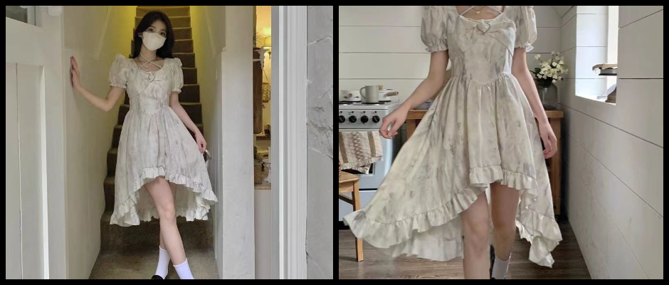 大码甜辣水墨新款晕染碎花荷叶边连衣裙法式在逃公主裙不规则裙夏 s
