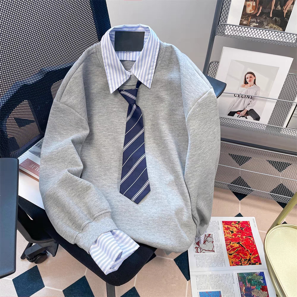 设计感强,面料柔软舒服,款式减龄,款式时尚学院风灰色拼接衬衫假两件套头卫衣女2023秋季新款小众设计感套装