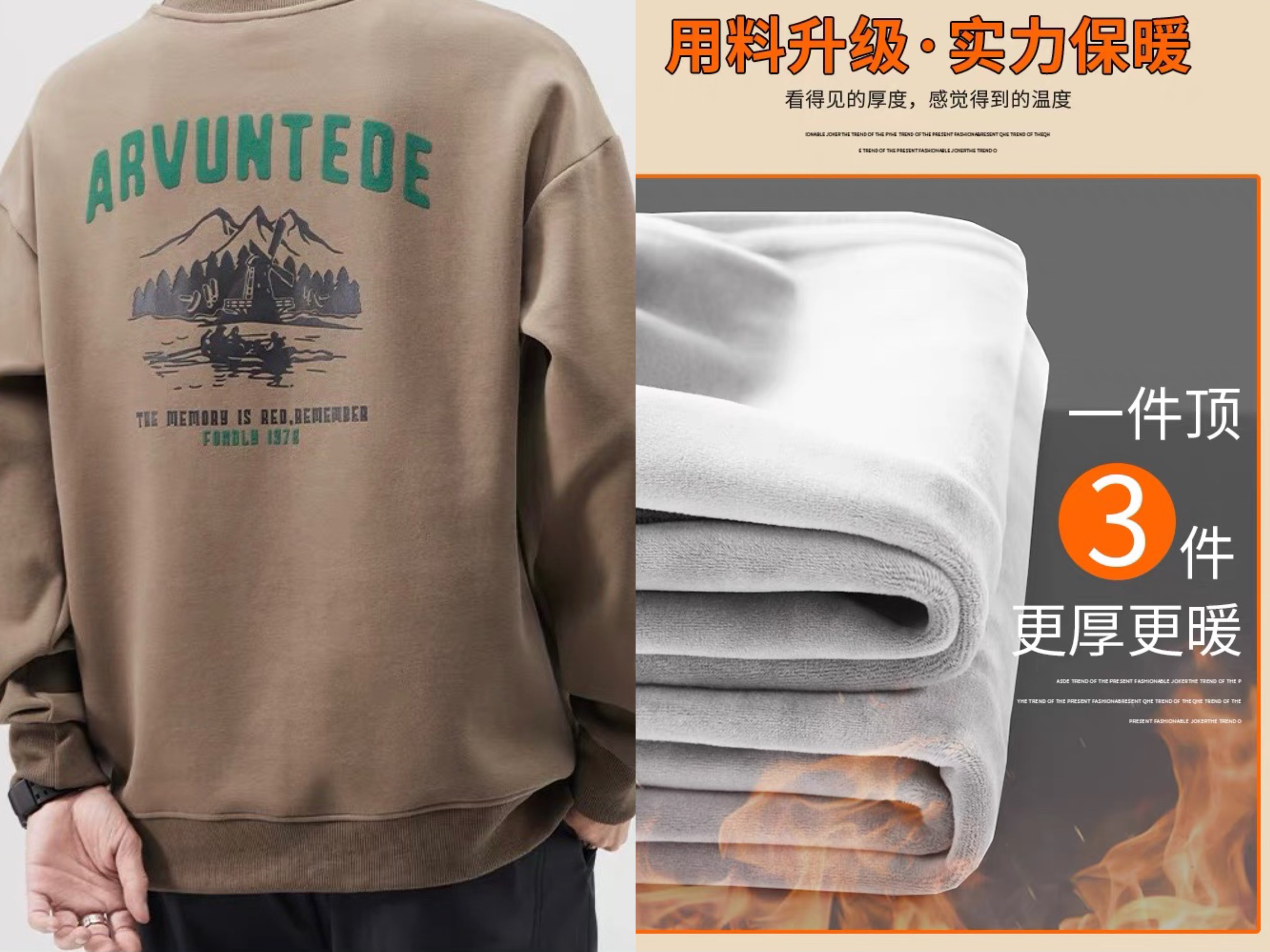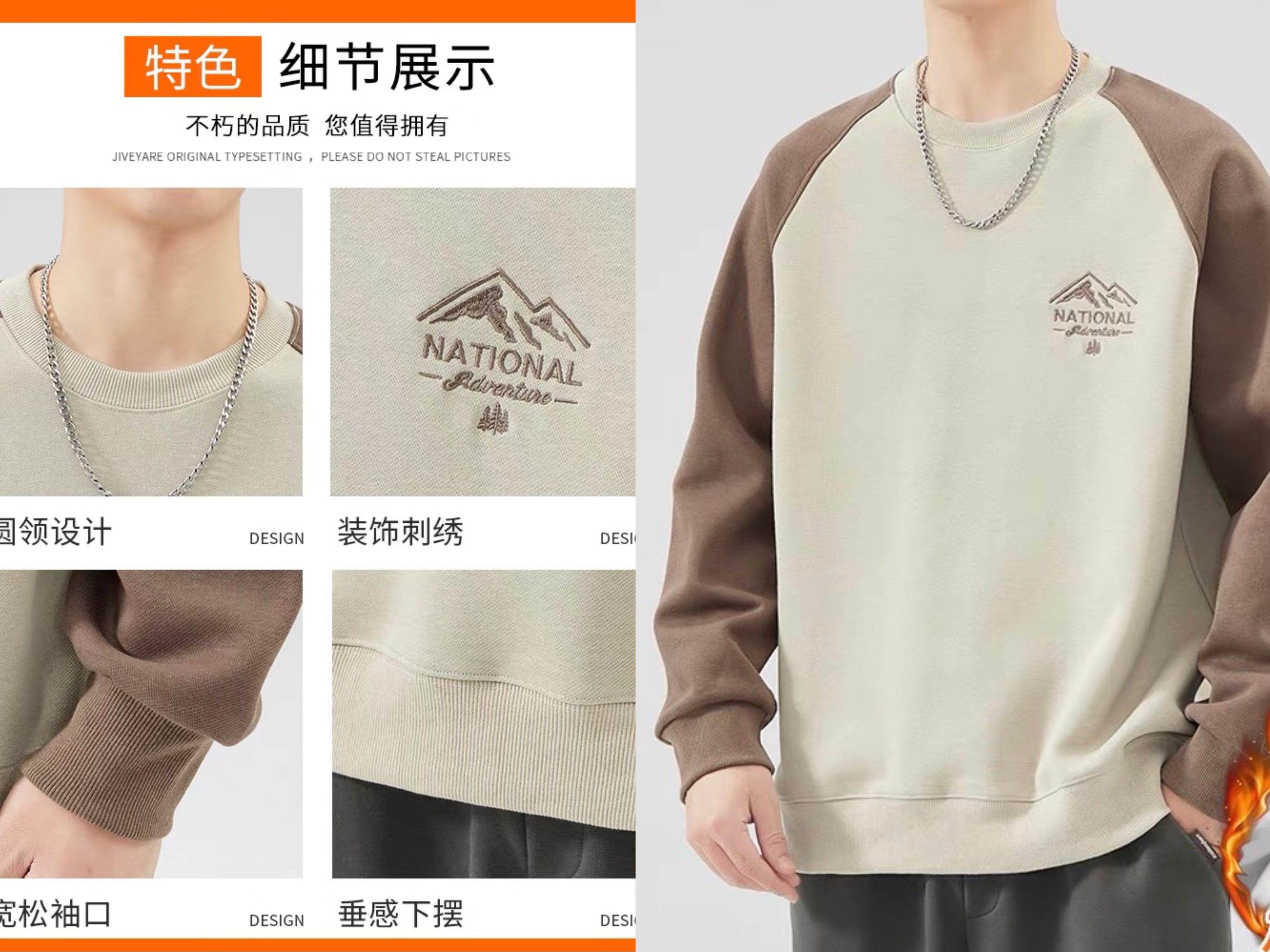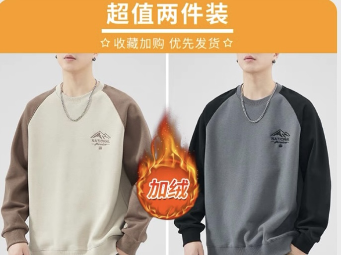 撞色圆领卫衣男士加绒加厚秋冬款长袖打底衫冬季2023新款男装上衣柔顺保暖加厚卫衣