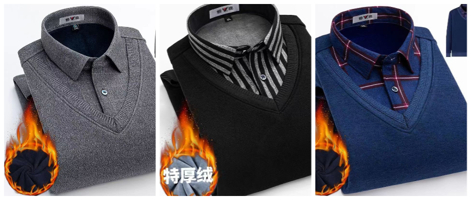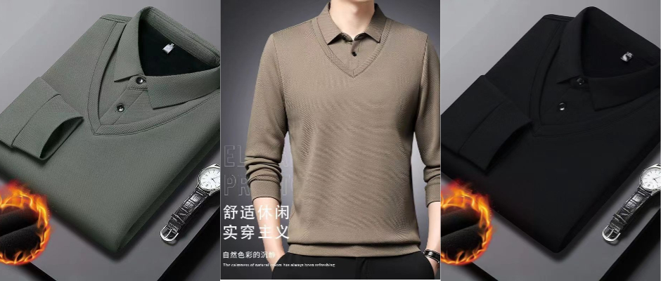 秋冬男士长袖T恤衬衫领假两件打底衫加绒加厚纯棉翻领上衣保暖衣 绿色 M