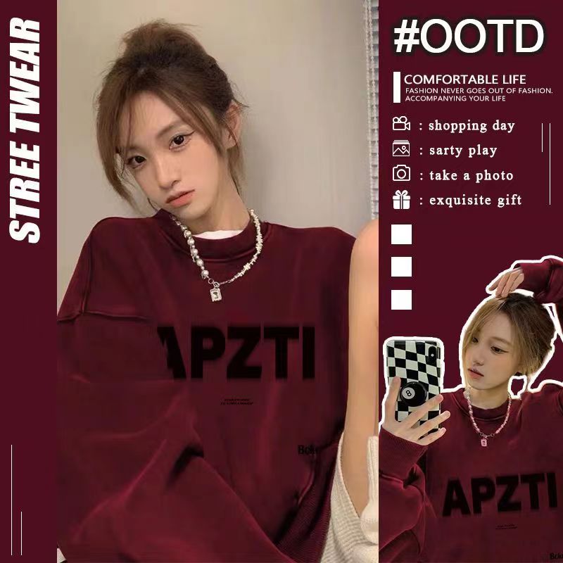日系酒红色字母无帽卫衣秋冬2023新款oversize宽松圆领长袖女上衣
