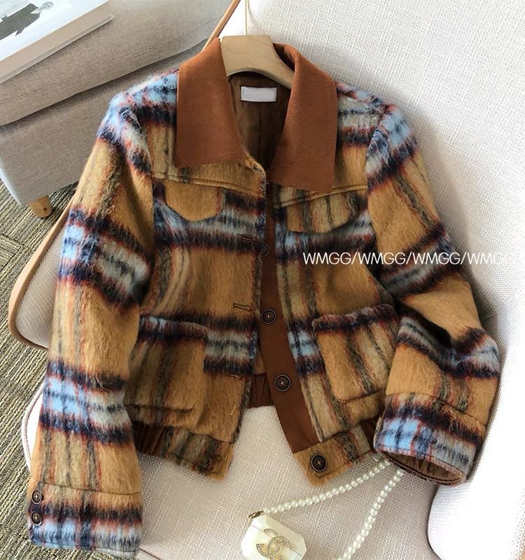 韩系格纹毛呢外套女小个子秋冬设计感小众慵懒风加厚短款夹克上衣