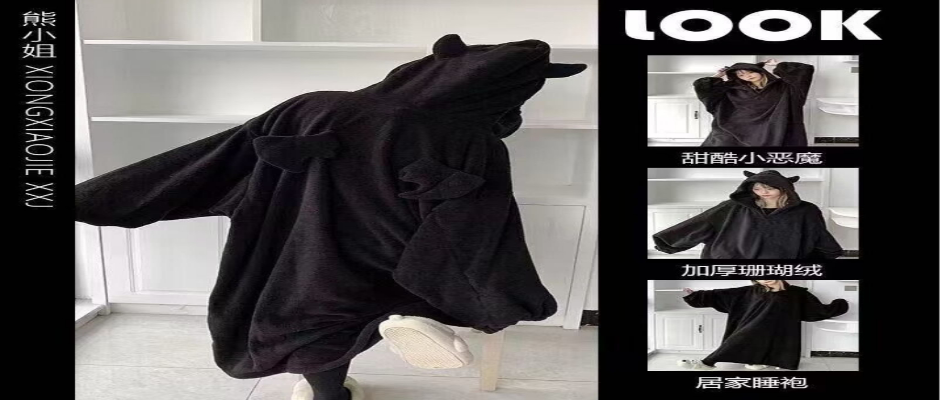 秋冬季珊瑚绒睡衣女加绒加厚宽松超大连帽小恶魔连体睡袍家居服潮
