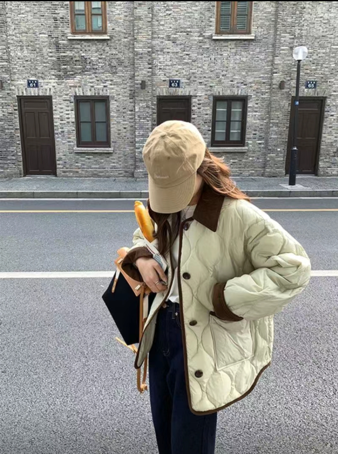 2023年新款羽绒服女韩系短款白鸭绒撞色翻领菱格冬季外套小香风