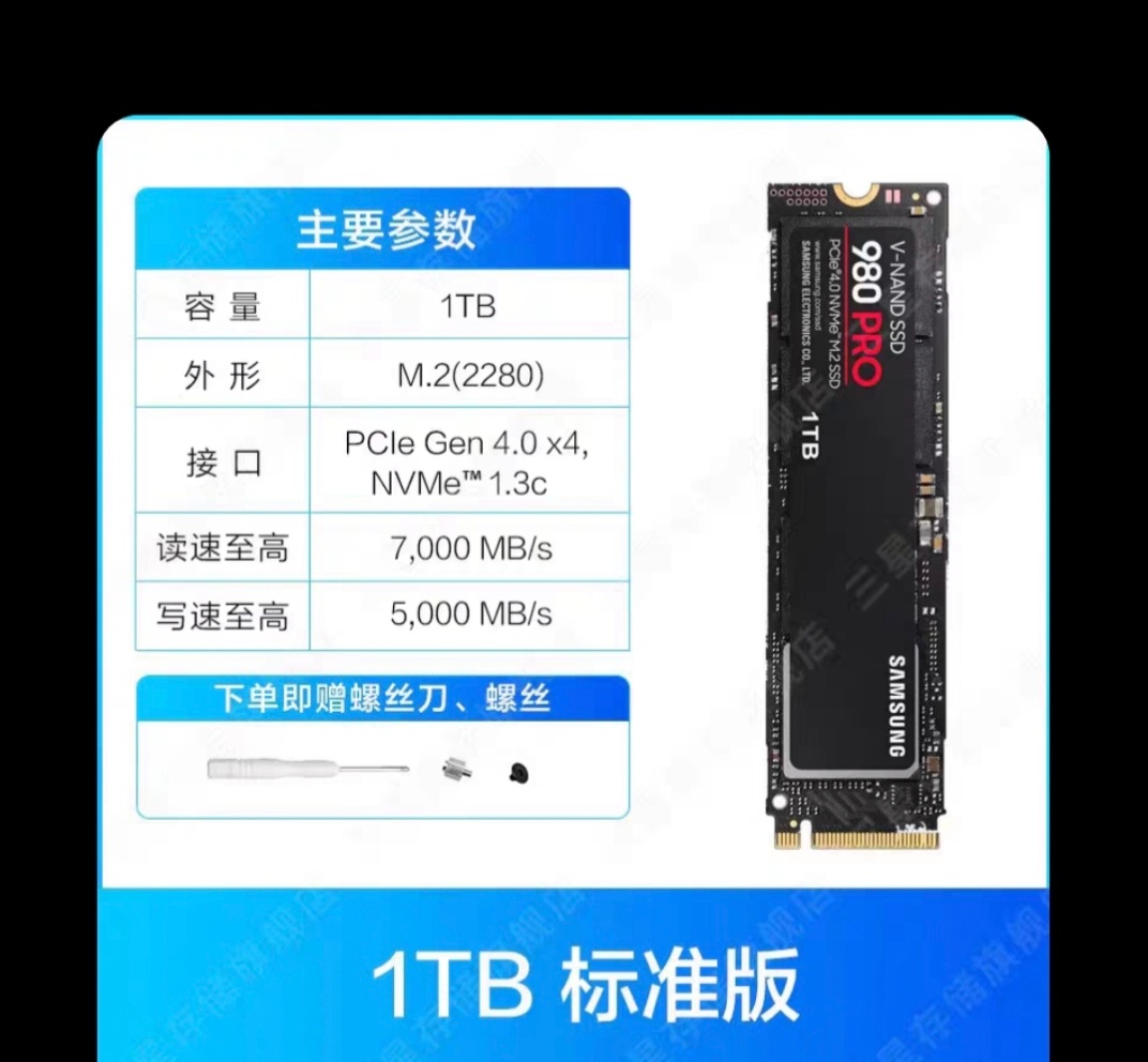 三星980 PRO固态硬盘1TB NVMeM.2笔记本电脑PS5台式机PCle4.0SSD