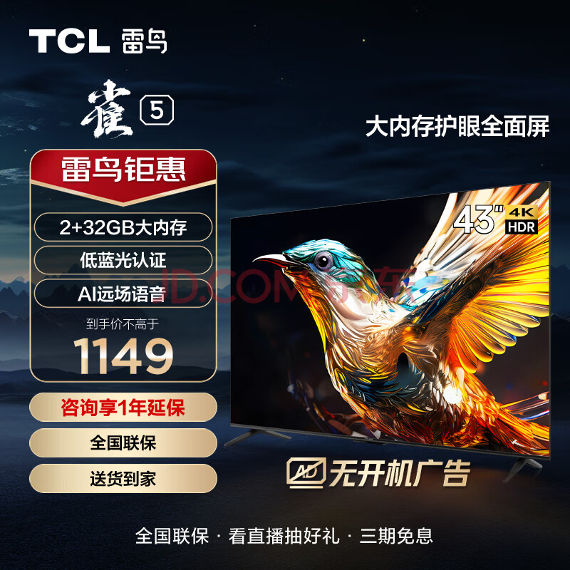TCL雷鸟 雀5 43英寸电视 4K超高清 护眼防蓝光 超薄全面屏 2+32GB 游戏智能液晶平板电视机43F275C