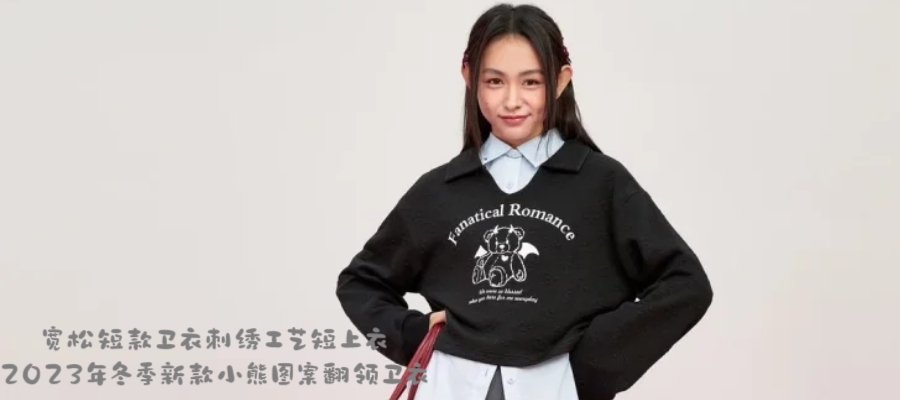 宽松短款卫衣刺绣工艺短上衣2023年冬季新款小熊图案翻领卫衣