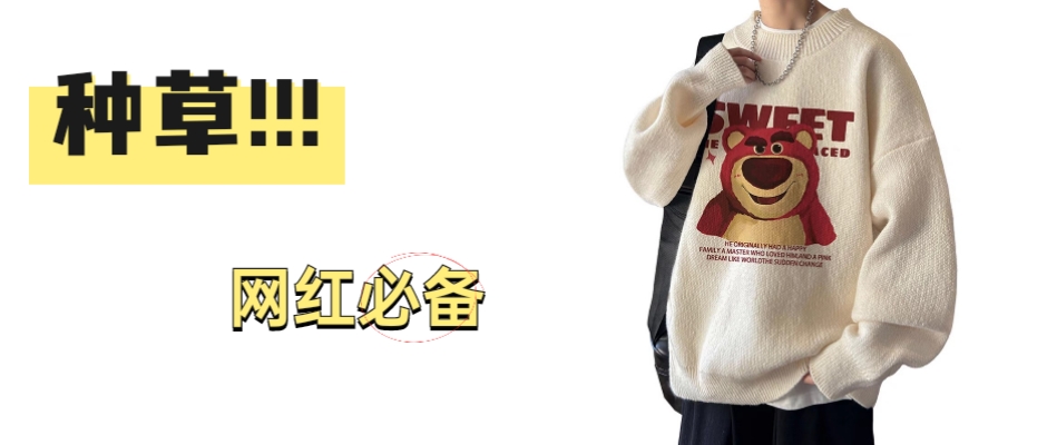 草莓熊慵懒毛衣男秋冬美式加厚圆领内搭针织衫潮牌宽松情侣款线衣