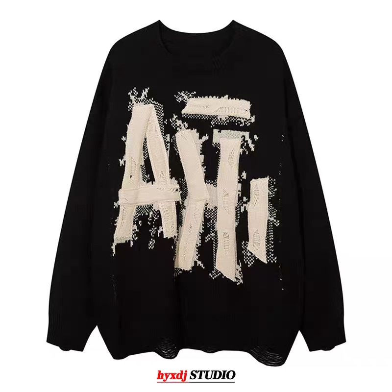 hyxdj潮牌美式高街设计感贴布绣毛衣男女oversize炸街宽松针织衫