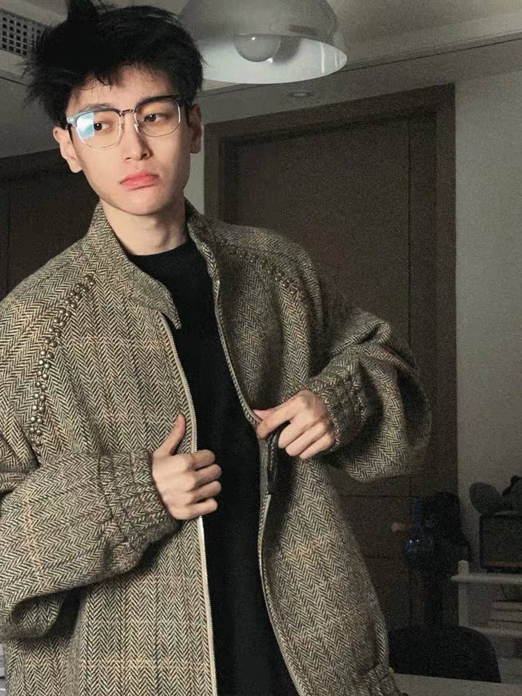ins美式复古设计感铆钉格纹毛呢外套男 秋季休闲百搭宽松情侣夹克