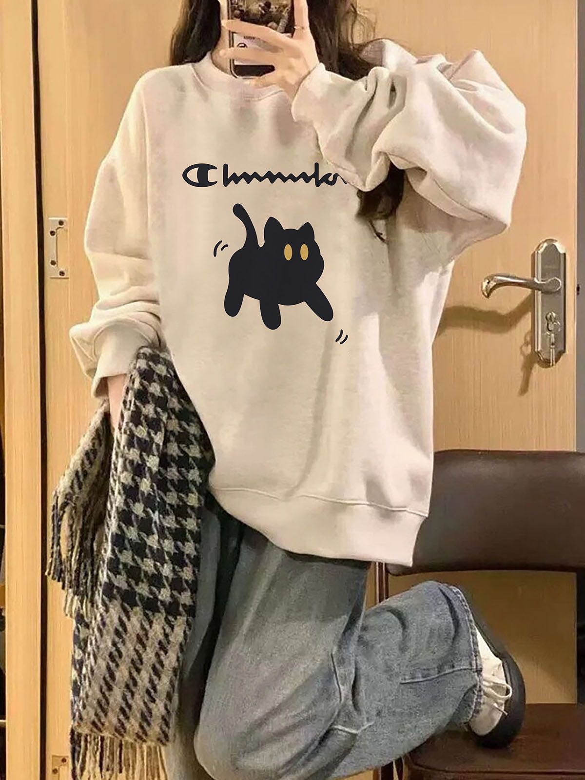 美版冠军chic超好看卡通猫咪卫衣女春秋宽松高级感休闲百搭上衣潮