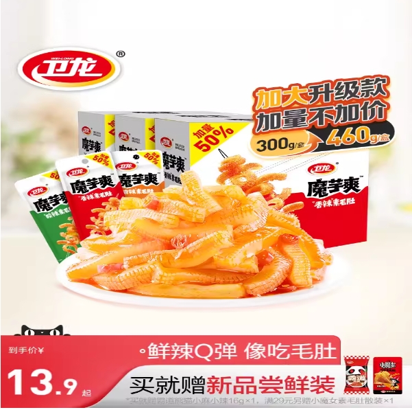 卫龙魔芋爽辣条魔芋素毛肚素肉晚上解饿小零食休闲食品小吃大礼包