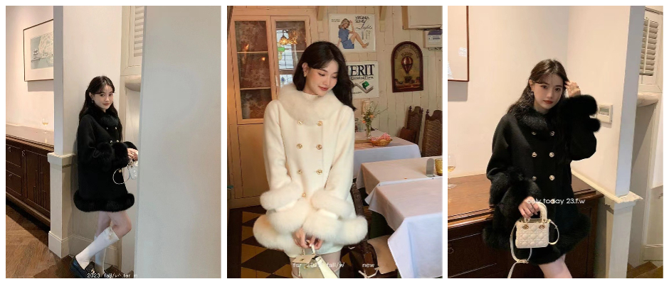 2023秋冬新款宫廷风仿狐狸毛拼接双排扣名媛气质加厚呢子大衣外套 黑 S