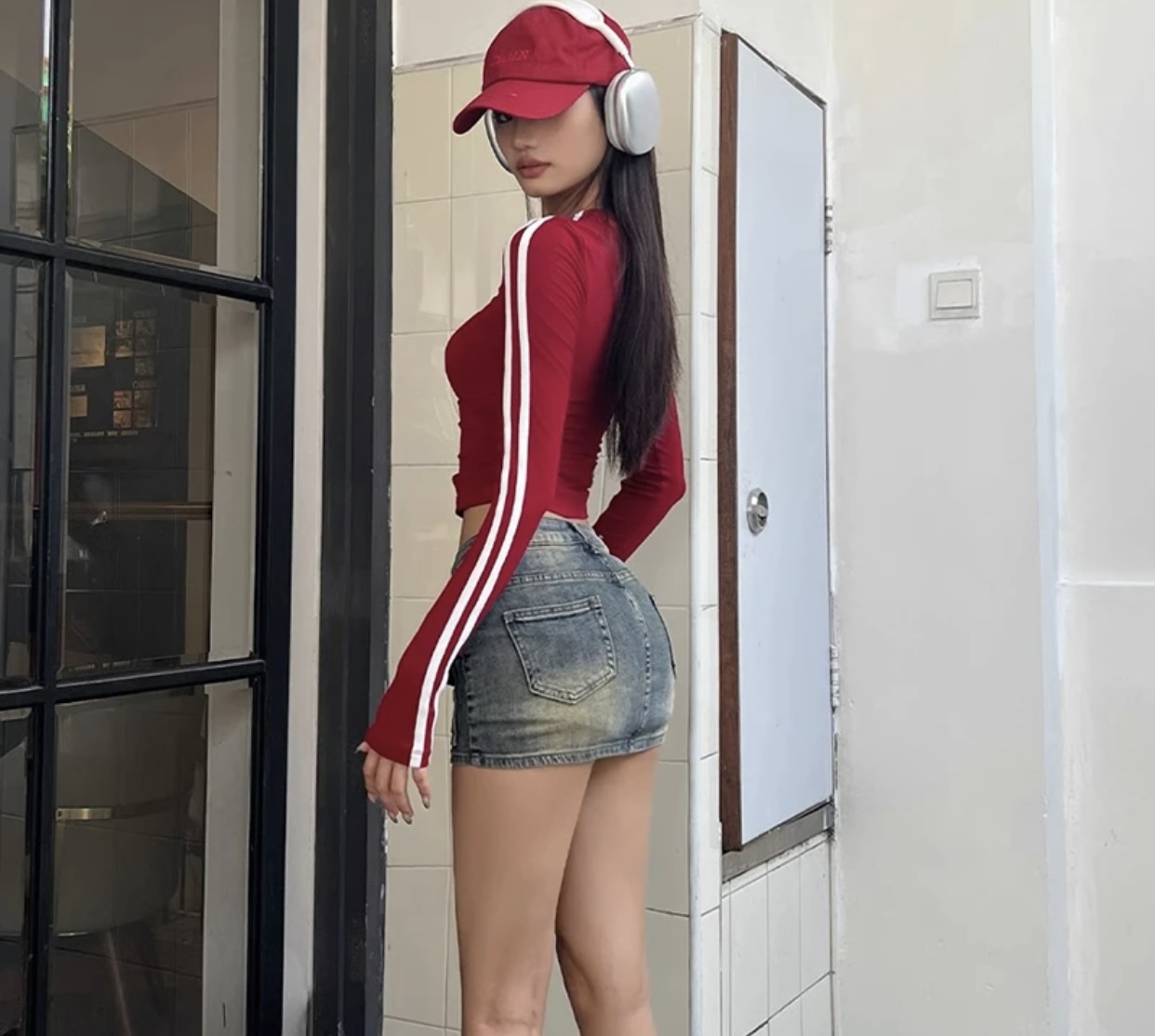 红色气质紧身长袖t恤女秋季美式修身露脐圆领遮肉收腰上衣短款ins