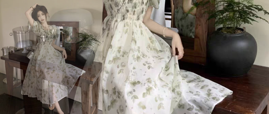 森系田园风雪纺碎花连衣裙女夏季2024新款方领中长款褶皱收腰裙子