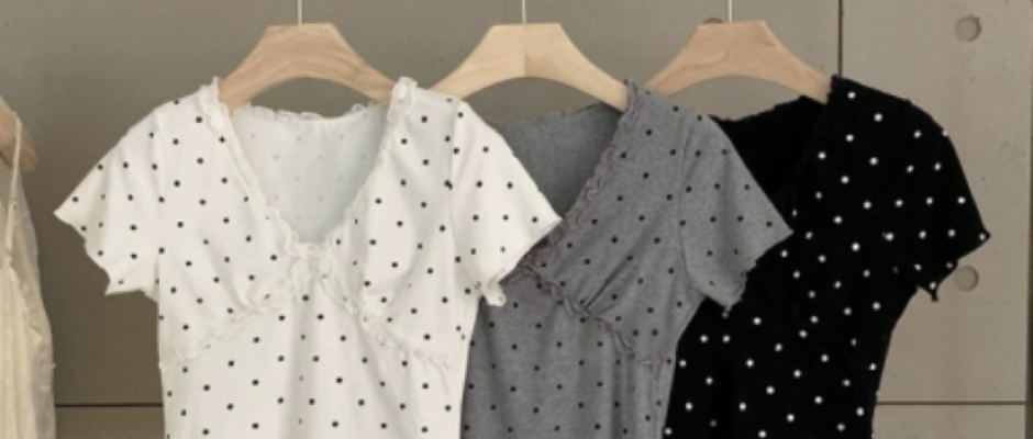 蕾丝短袖T恤女夏季2024年新款V领半袖正肩设计感灰色波点短款上衣