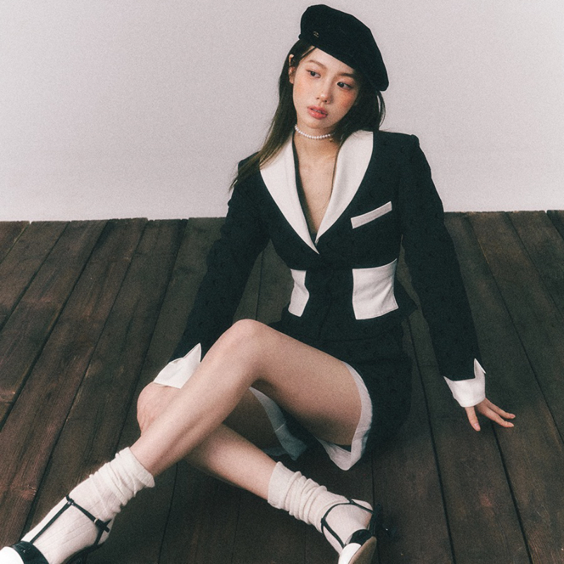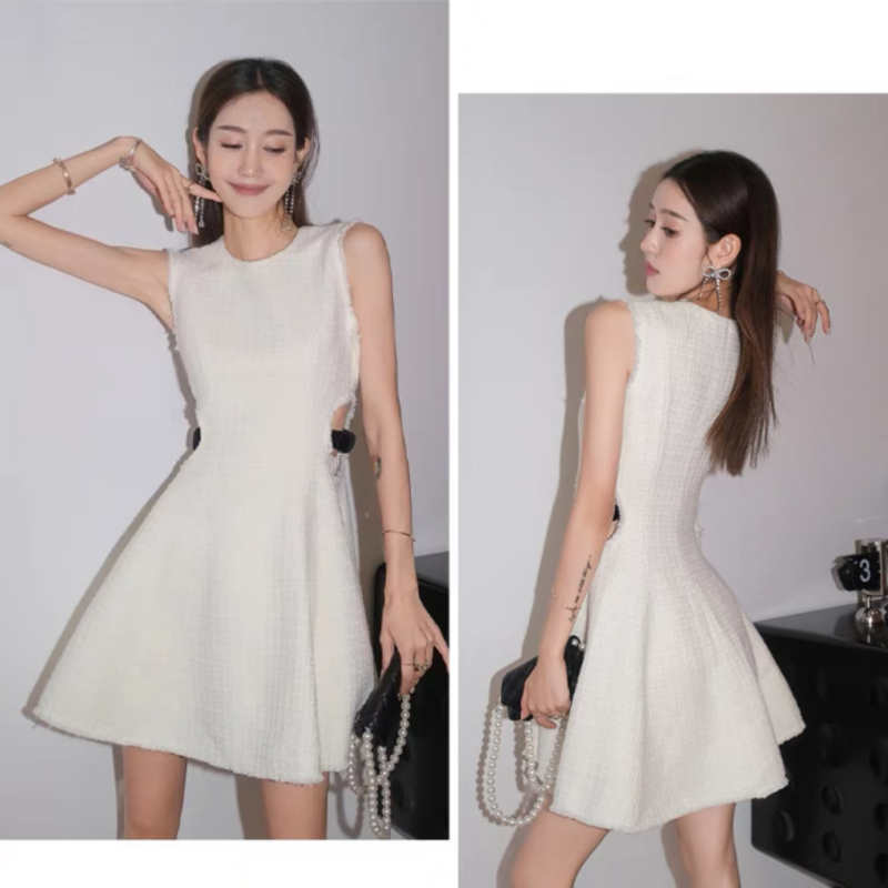 小香风女套装 白色蝴蝶结西装外套+时尚气质连衣裙