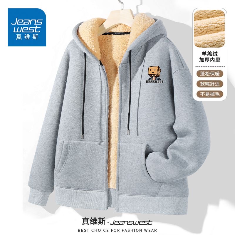 真维斯加绒开衫连帽卫衣男冬季新款宽松羊羔绒男士大码厚夹克外套