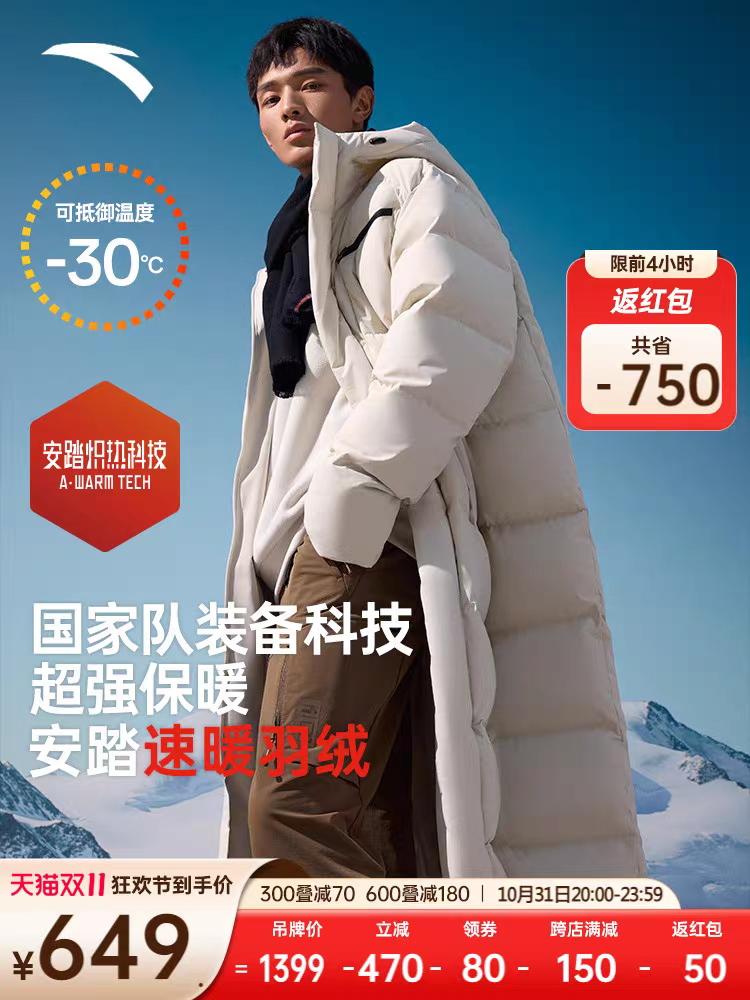 安踏速暖羽绒丨过膝长款羽绒服男冬季新款防泼水鸭绒保暖通勤外套