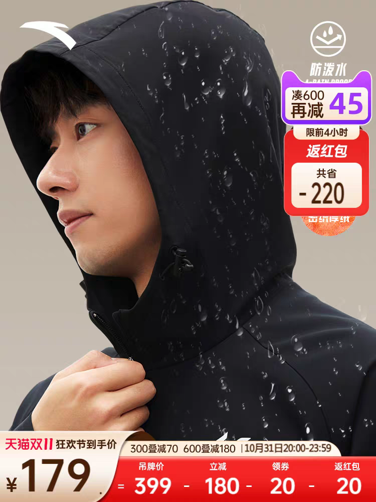 安踏防泼水外套丨防风加绒夹克男士冬季新款登山黑色外套运动上衣