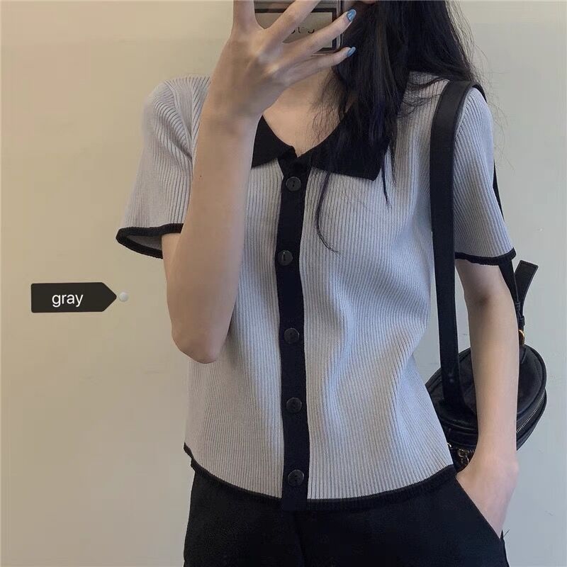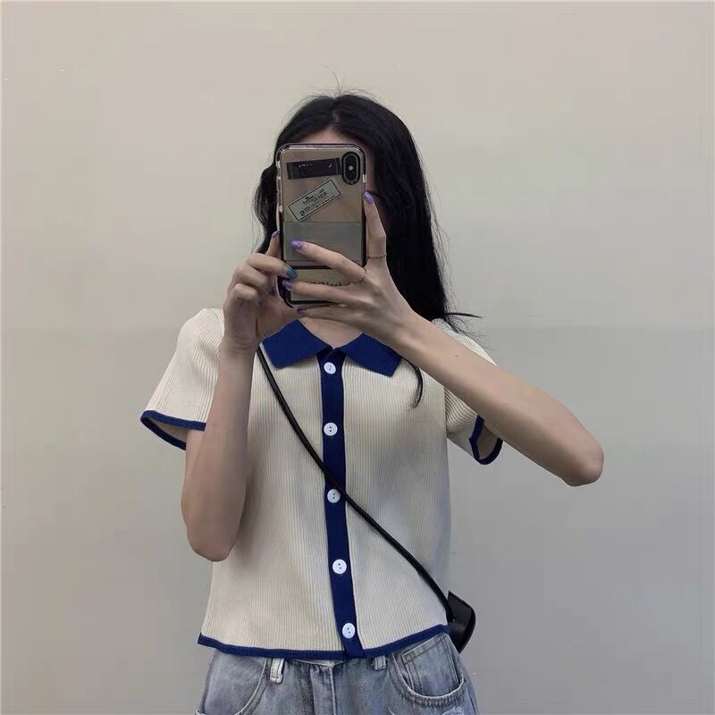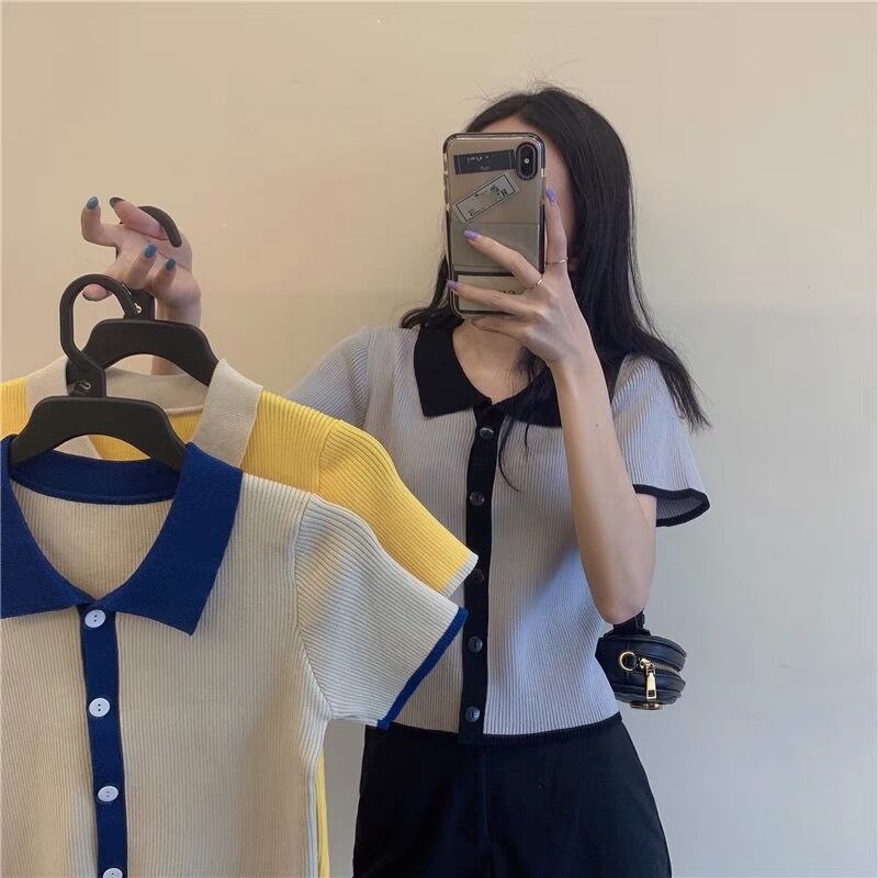 韩风T恤女夏装2021新款撞色POLO领短袖针织上衣。上身效果很好,不起球,不掉色,穿着很舒服,还很百搭!物美廉价,价格便宜,喜欢的宝贝们要快快入手哦!