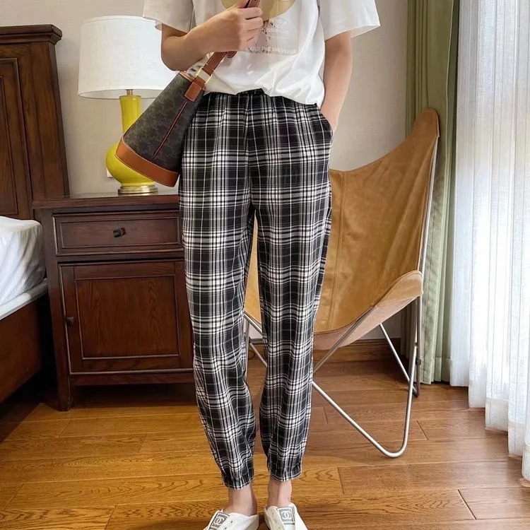 首页> 男装/ 女装/ 内衣> 女装> 短外套> 今年夏天真的得入!随性百搭,超级抗皱显瘦松紧腰黑白格子裤 高腰休闲裤小个子宽松棉麻 不挑人
