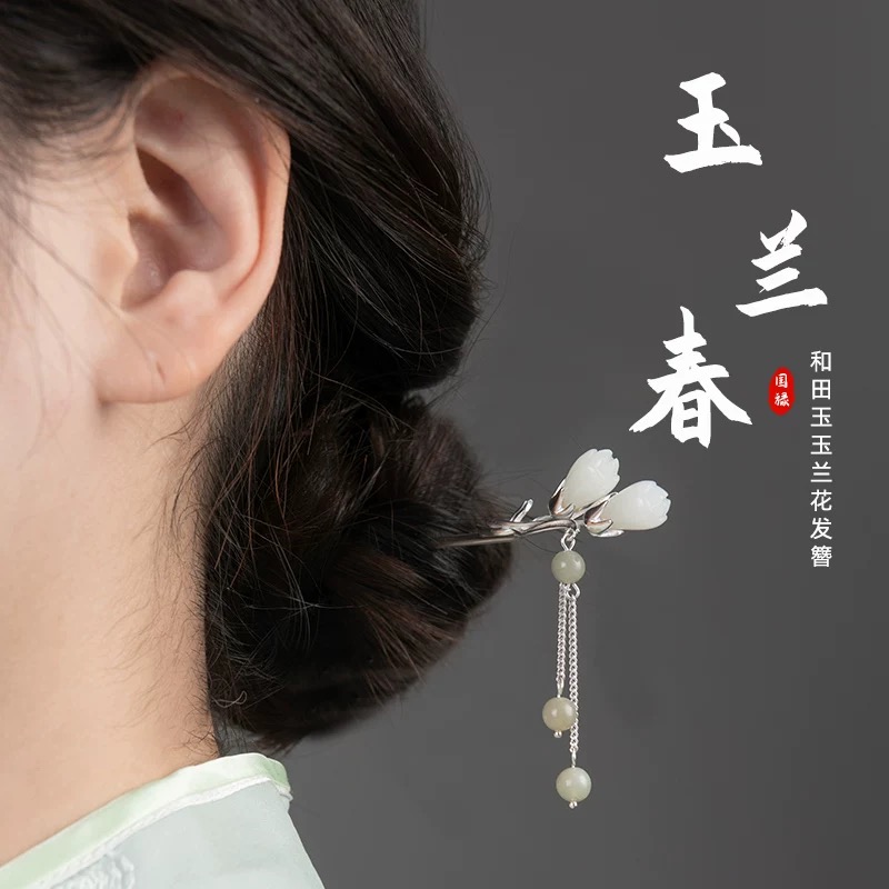 和田玉耳饰中国风耳夹女无耳洞青玉石古风耳环纯银新中式